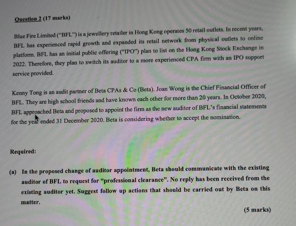 Question 2 17 Marks Blue Fire Limited Bfl Is A Chegg Com